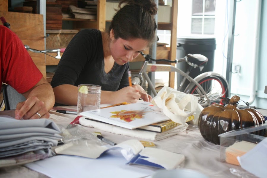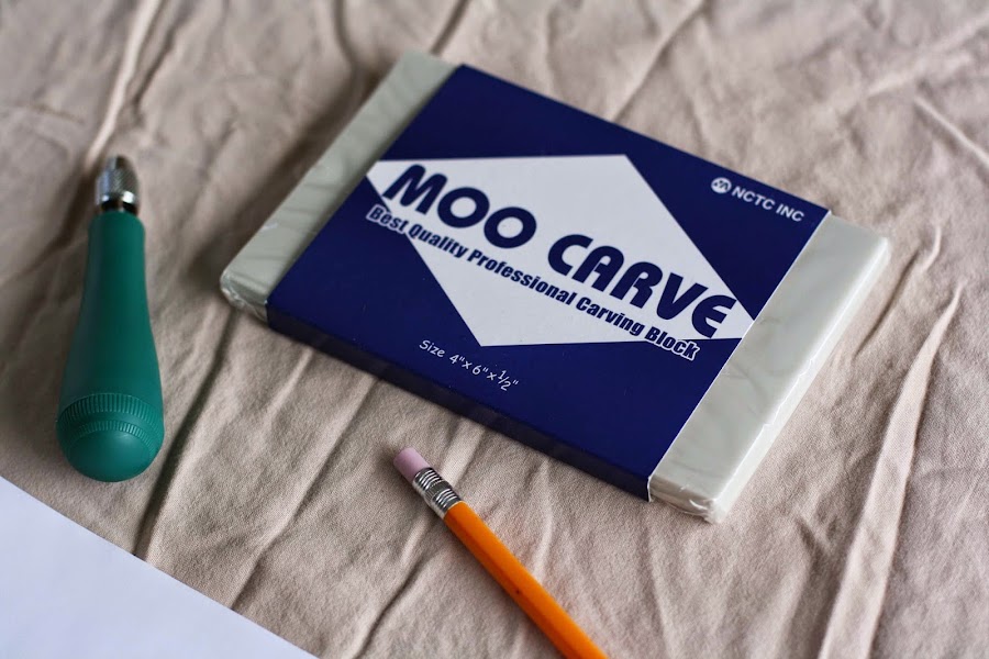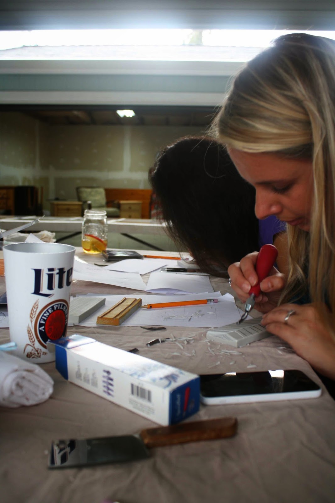 Heather brought all of the supplies, including the Carving blocks, ink, pencils, sketching notebooks, rollers and paint plates. Each of us came with material or fabric we wanted to print on — a note here, block-print on linen or something with a little bit of texture. As I mentioned, I brought towels to print on for holiday gifts. The girls brought a little bit of everything – blank totes, make-up bags, gift tags, blank cards and napkins. After doing some idea sketching and drawing out our designs, we started carving them into our blocks: