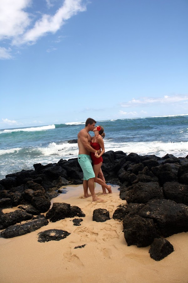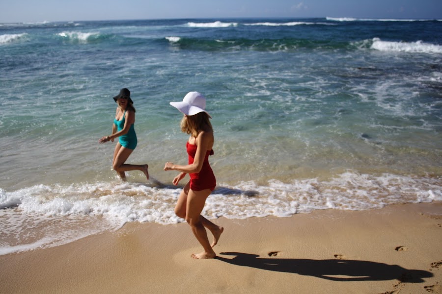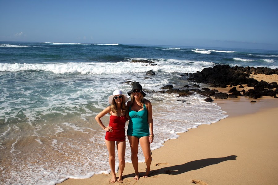 We picked the BEST day for our vintage hawaii day in Kauai. We spent the whole day just relaxing on the beach, sipping mai tais and pina coladas and going for dips in the ocean. This was EXACTLY what I wanted to do for my birthday. Just lounge, listen to the waves, smell the heavenly Hawaiian air, and soak in time with my sister. The perfect birthday gift if you ask me. This day will go down as one of the happiest days of my life. I love these two people so much. I was pretty pleased with our suits and accessories for my vintage beach theme, too. And, I LOVED my bathing suit. LOVED IT.
