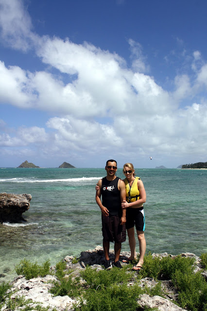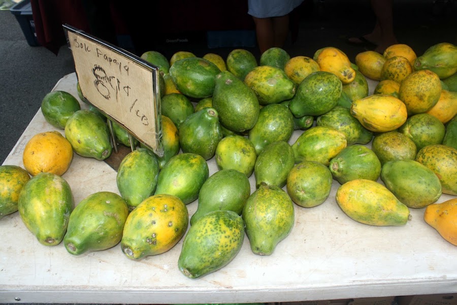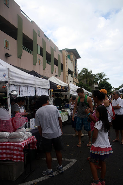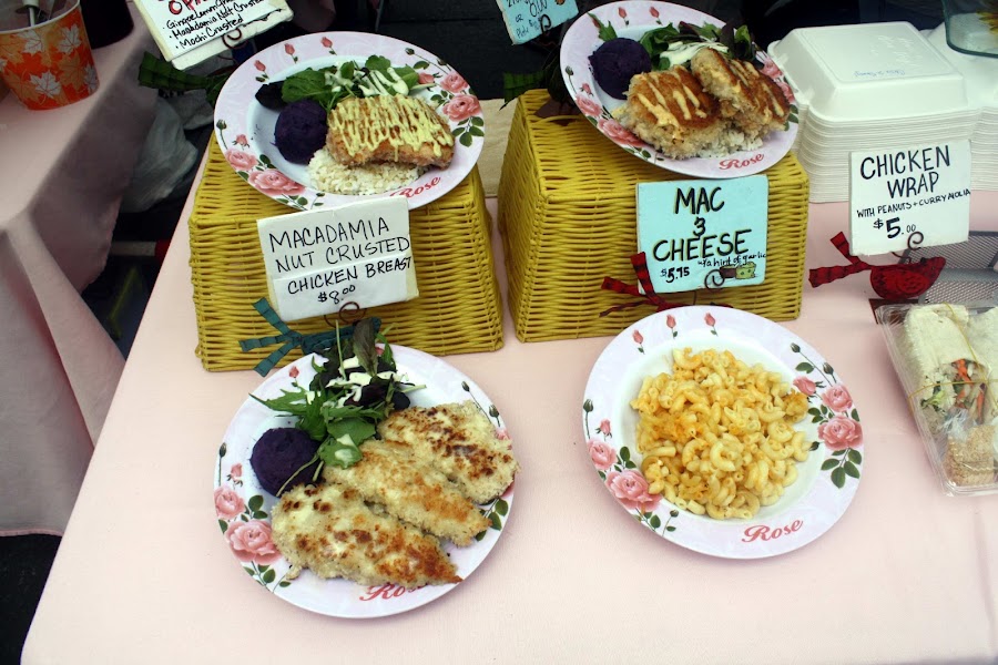 Next stop was Olomana Orchids, and then Kailua beach for brunch, kayaking and dinner at the Farmer’s Market. I don’t know what was better, the guava chiffon pancakes or the macadamia nut-crusted chicken. Actually, everything we ate pretty much rocked. We just went from booth to booth, eating and trying different fruits and foods. Hawaiian Farmer’s Markets are SO different from California Farmer’s Markets. The community actually comes to eat dinner, then grocery-shop.