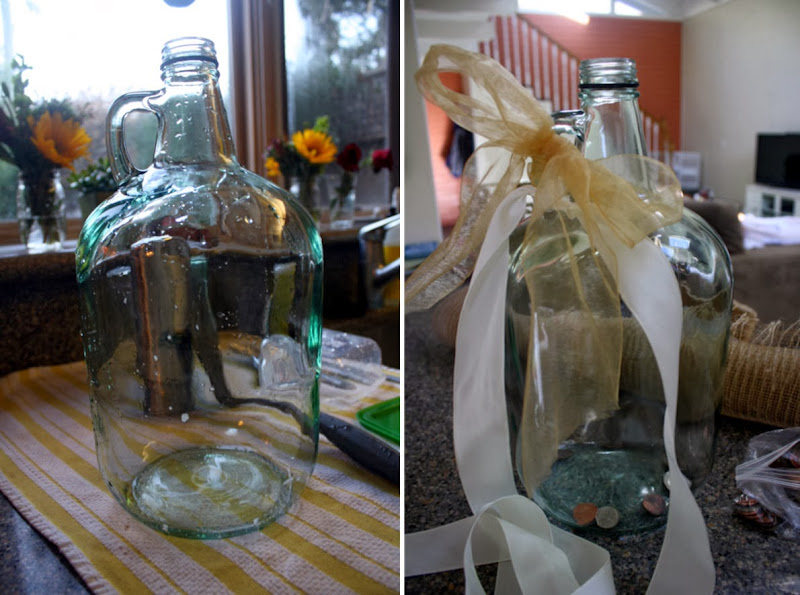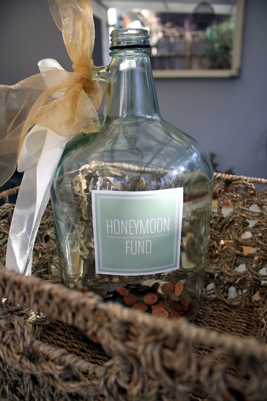 - Honeymoon Fund jar – buy a glass jug of wine, empty it {or just have some girlfriends over to help you drink it all}, wash, wrap with ribbon and add label. I added some coins to get them started, too ;)