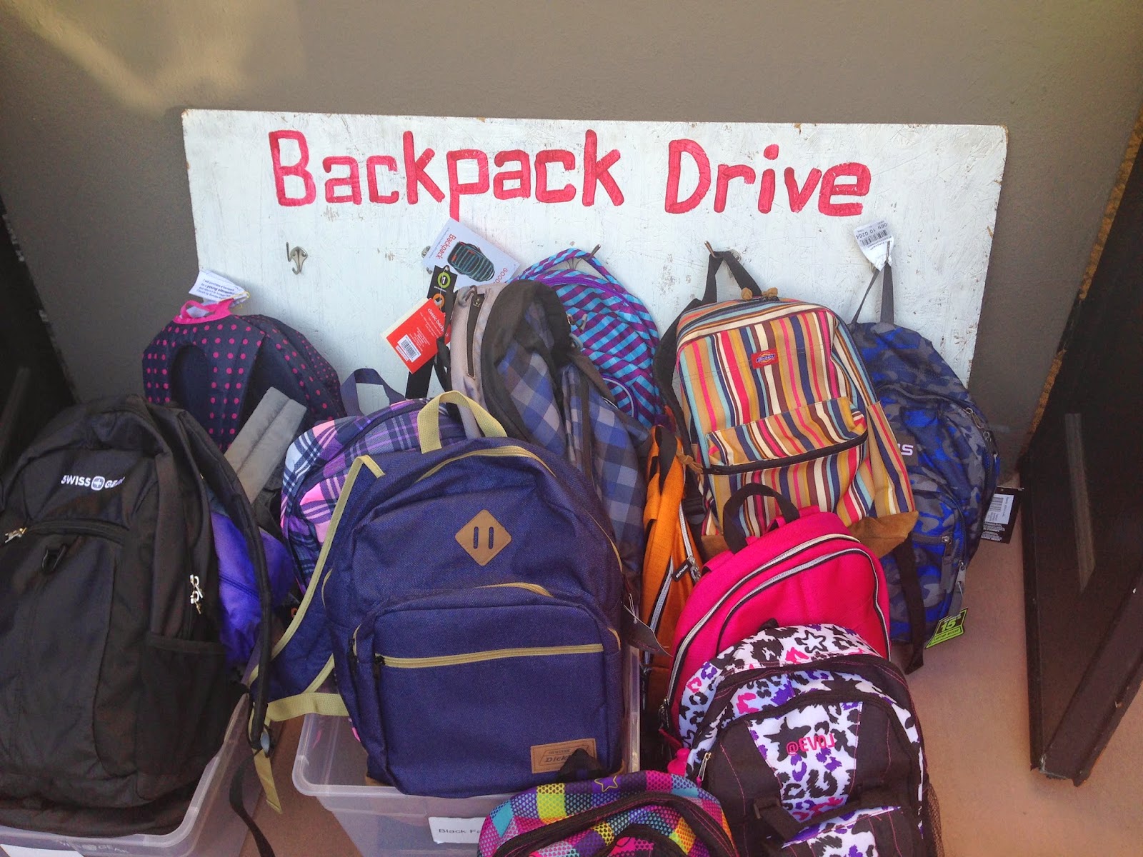 {Helped organize the backpack drive at our church this summer. We received 100 backpacks – awesome!}